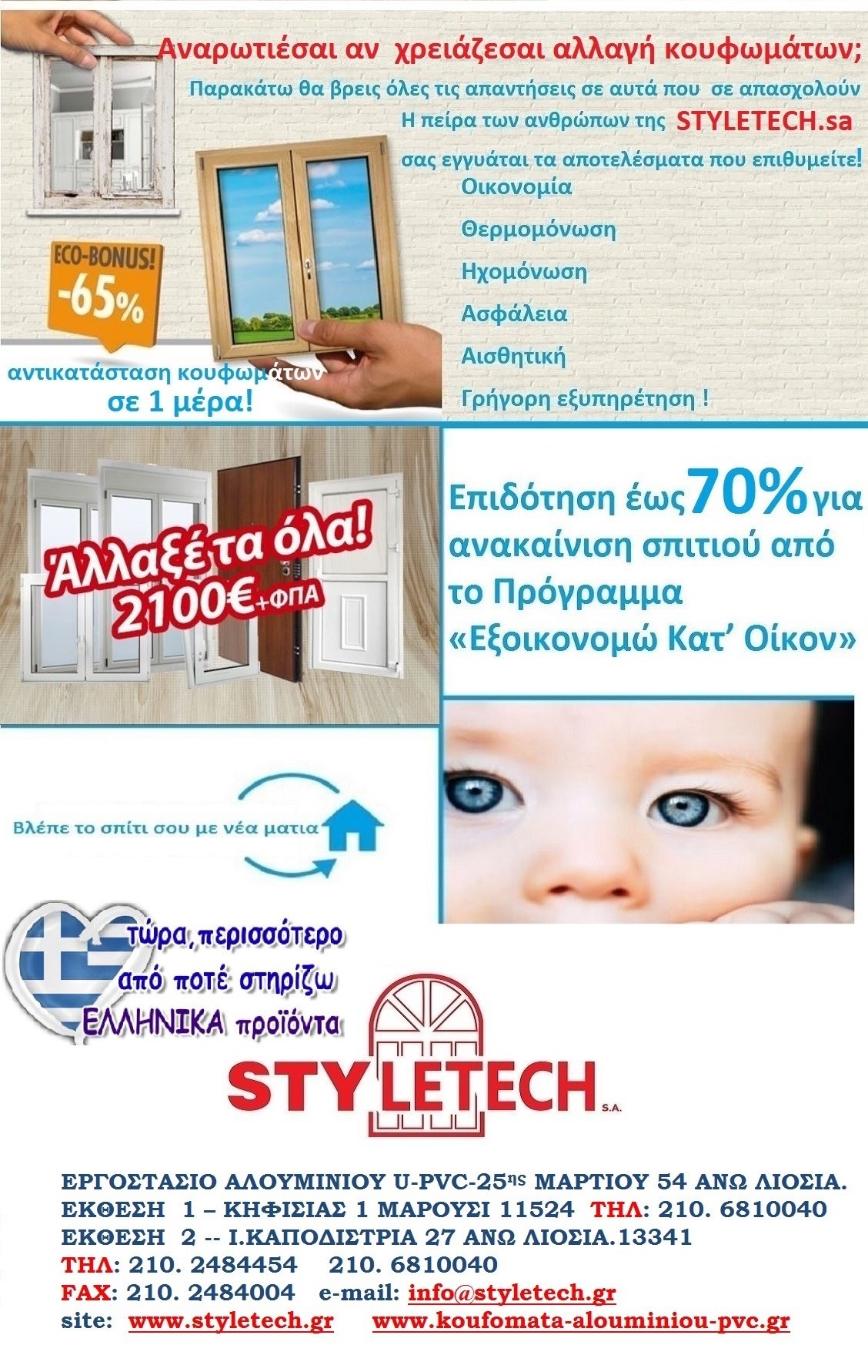 Παράγουμε, κατασκευάσουμε κουφώματα, αλουμινίου, pvc, συνθετικά, Etem, Europa, Rehau, ηχομόνωση, θερμομόνωση, ενεργειακά, εξοικονομώ κατ'οίκον, ανακαίνιση, αντικατάσταση, εγγύηση   Προφίλ εταιρείας STYLETECH.sa Σας ευχαριστούμε για το ενδιαφέρον σας στα προϊόντα της εταιρίας µας. H STYLETECH είναι µια κατασκευαστική εταιρία κουφωμάτων αλουμινίου και U-pvc. Ιδρύθηκε το 1992 και είναι από τις πιο ραγδαία αναπτυσσόμενες του κλάδου. Με πάνω από 36 χρόνια εμπειρίας και σύγχρονης τεχνολογίας κουφωμάτων, παράγουμε προϊόντα υψηλής ποιότητας που δημιουργούν αξία για τους πελάτες μας μειώνοντας παράλληλα το κόστος. Η ευέλικτη δομή της εταιρείας μας, σε συνδυασμό με την τεχνογνωσία των εργαζομένων και των συνεργατών μας εγγυώνται την σταθερή ποιότητα και την τεχνική ακμή ολόκληρης της γραμμής μας. Πέρα από τον άρτιο και σύγχρονο µηχανολογικό µας εξοπλισµό αλλά και το εξειδικευµένο προσωπικό, έχουµε αποκτήσει τα απαιτούμενα πιστοποιητικά ποιότητος, και συνεχώς βελτιωνόμαστε τεχνολογικά ,με σεβασμό στο περιβάλλον. Στα πατζούρια, έχουµε την δυνατότητα να παράγουµε δικό µας προφίλ, το οποίο είναι πιστοποιημένο με αποκλειστικότητα σε 9 μποφόρ και class 6. Μπορεί να κατασκευαστεί σε µονόφυλλο, δίφυλλο, τρίφυλλο, τετράφυλλο και εξάφυλλο. ∆ίνουµε µεγάλη σηµασία στην λεπτοµέρεια και την λειτουργικότητα της κατασκευής, για αυτό οι συνδέσεις κουφωμάτων βαρέων προφίλ και θέρμο γίνονται µε δέσιµο πρέσας, η οποία είναι 100% προφίλ αλουµινίου και µπαίνει µε ειδική κόλλα και αρµόκολλα στις διατοµές του προφίλ. Το δύσκολο δεν είναι αποθαρρυντικό, αλλά αποτελεί για εμάς πρόκληση! Από τότε έως σήμερα, βασισμένη πάντα στο δημιουργικό μεράκι και την πείρα, και με αποκλειστικό γνώμονα όλες τις αρχιτεκτονικές απαιτήσεις των πελατών, προσφέρει κατασκευές με εξαιρετική αντοχή και αισθητική, όπου καλύπτουν τις ανάγκες σε κουφώματα, κάγκελα, πόρτες και παράθυρα. Η εταιρεία διαθέτει συστήματα αλουμινίου και u-pvc, για ιδιώτες που θέλουν αξιόπιστες λύσεις για το σπίτι. Τα ποιοτικά συστήματα αλουμινίου και u-pvc, προηγμένης τεχνολογίας που προσφέρονται στην STYLETECH.sa, εγγυώνται σίγουρα αποτελέσματα και την δυνατότητα στην προσφυγή ευέλικτων λύσεων, επιφέροντας πάντα το αισθητικά επιθυμητό, αλλά και λειτουργικό αποτέλεσμα. Για τις κατασκευαστικές εταιρείες, η εταιρεία STYLETECH.sa προτείνει προϊόντα που πληρούν όλες τις ευρωπαϊκές προδιαγραφές με όλες τις απαραίτητες-διεθνής-πιστοποιήσεις. Η εταιρεία μας, έχοντας μία πολύχρονη πετυχημένη και συνεπή παρουσία στην ελληνική αγορά, είναι σήμερα ένα από τα πλέον αξιόλογα ονόματα στον χώρο των κατασκευών αλουμινίου και u-pvc. Η πολυετής παρουσία μας στον κλάδο κατασκευής αλουμινίου και u-pvc, και οι ικανοποιημένοι πελάτες μας, είναι εγγύηση ότι οι κατασκευές μας υπερέχουν από πλευράς ποιότητας, λειτουργικότητας και αισθητικής. Η ιδιαίτερη επιμέλεια στη ποιοτική κατασκευή των προϊόντων, η σωστή εφαρμογή τους, η προσοχή στη λεπτομέρεια και η συνέπεια στους χρόνους παράδοσης, χαρακτηρίζουν την εταιρεία και της χαρίζουν ένα όνομα εμπιστοσύνης. Η εταιρεία μας επιλέγει τα προφίλ αλουμινίου της Εtem building, Europa, Alouminco, της μοναδικής εταιρείας στο είδος της, που απέκτησε τα Ευρωπαϊκά εξειδικευμένα πιστοποιητικά ποιότητας QUALANOD (για την ανοδίωση) και QUALICOAT (για την ηλεκτροστατική βαφή). Η εταιρεία μας επιλέγει τα προφίλ u-pvc, από τις πιο αξιόλογες εταιρείες τις ευρωπαϊκ