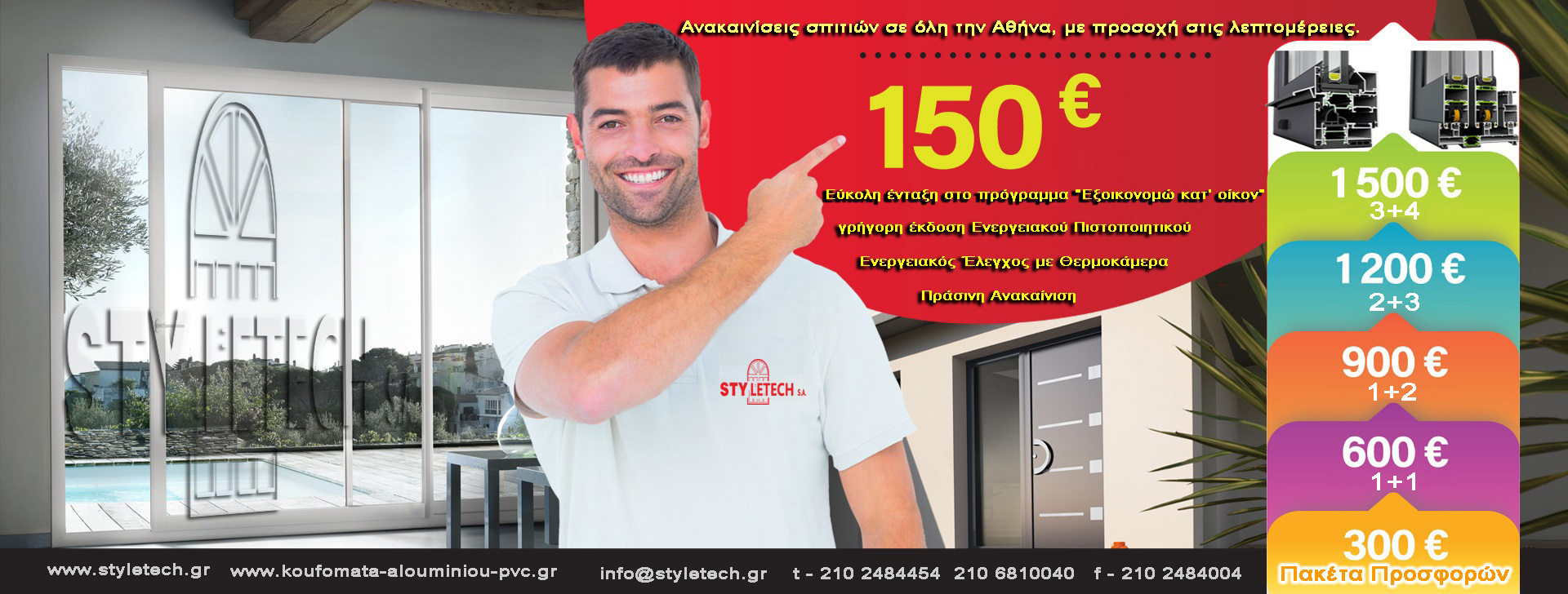 Παράγουμε, κατασκευάσουμε κουφώματα, αλουμινίου, pvc, συνθετικά, Etem, Europa, Rehau, ηχομόνωση, θερμομόνωση, ενεργειακά, εξοικονομώ κατ'οίκον, ανακαίνιση, αντικατάσταση, εγγύηση   Προφίλ εταιρείας STYLETECH.sa Σας ευχαριστούμε για το ενδιαφέρον σας στα προϊόντα της εταιρίας µας. H STYLETECH είναι µια κατασκευαστική εταιρία κουφωμάτων αλουμινίου και U-pvc. Ιδρύθηκε το 1992 και είναι από τις πιο ραγδαία αναπτυσσόμενες του κλάδου. Με πάνω από 36 χρόνια εμπειρίας και σύγχρονης τεχνολογίας κουφωμάτων, παράγουμε προϊόντα υψηλής ποιότητας που δημιουργούν αξία για τους πελάτες μας μειώνοντας παράλληλα το κόστος. Η ευέλικτη δομή της εταιρείας μας, σε συνδυασμό με την τεχνογνωσία των εργαζομένων και των συνεργατών μας εγγυώνται την σταθερή ποιότητα και την τεχνική ακμή ολόκληρης της γραμμής μας. Πέρα από τον άρτιο και σύγχρονο µηχανολογικό µας εξοπλισµό αλλά και το εξειδικευµένο προσωπικό, έχουµε αποκτήσει τα απαιτούμενα πιστοποιητικά ποιότητος, και συνεχώς βελτιωνόμαστε τεχνολογικά ,με σεβασμό στο περιβάλλον. Στα πατζούρια, έχουµε την δυνατότητα να παράγουµε δικό µας προφίλ, το οποίο είναι πιστοποιημένο με αποκλειστικότητα σε 9 μποφόρ και class 6. Μπορεί να κατασκευαστεί σε µονόφυλλο, δίφυλλο, τρίφυλλο, τετράφυλλο και εξάφυλλο. ∆ίνουµε µεγάλη σηµασία στην λεπτοµέρεια και την λειτουργικότητα της κατασκευής, για αυτό οι συνδέσεις κουφωμάτων βαρέων προφίλ και θέρμο γίνονται µε δέσιµο πρέσας, η οποία είναι 100% προφίλ αλουµινίου και µπαίνει µε ειδική κόλλα και αρµόκολλα στις διατοµές του προφίλ. Το δύσκολο δεν είναι αποθαρρυντικό, αλλά αποτελεί για εμάς πρόκληση! Από τότε έως σήμερα, βασισμένη πάντα στο δημιουργικό μεράκι και την πείρα, και με αποκλειστικό γνώμονα όλες τις αρχιτεκτονικές απαιτήσεις των πελατών, προσφέρει κατασκευές με εξαιρετική αντοχή και αισθητική, όπου καλύπτουν τις ανάγκες σε κουφώματα, κάγκελα, πόρτες και παράθυρα. Η εταιρεία διαθέτει συστήματα αλουμινίου και u-pvc, για ιδιώτες που θέλουν αξιόπιστες λύσεις για το σπίτι. Τα ποιοτικά συστήματα αλουμινίου και u-pvc, προηγμένης τεχνολογίας που προσφέρονται στην STYLETECH.sa, εγγυώνται σίγουρα αποτελέσματα και την δυνατότητα στην προσφυγή ευέλικτων λύσεων, επιφέροντας πάντα το αισθητικά επιθυμητό, αλλά και λειτουργικό αποτέλεσμα. Για τις κατασκευαστικές εταιρείες, η εταιρεία STYLETECH.sa προτείνει προϊόντα που πληρούν όλες τις ευρωπαϊκές προδιαγραφές με όλες τις απαραίτητες-διεθνής-πιστοποιήσεις. Η εταιρεία μας, έχοντας μία πολύχρονη πετυχημένη και συνεπή παρουσία στην ελληνική αγορά, είναι σήμερα ένα από τα πλέον αξιόλογα ονόματα στον χώρο των κατασκευών αλουμινίου και u-pvc. Η πολυετής παρουσία μας στον κλάδο κατασκευής αλουμινίου και u-pvc, και οι ικανοποιημένοι πελάτες μας, είναι εγγύηση ότι οι κατασκευές μας υπερέχουν από πλευράς ποιότητας, λειτουργικότητας και αισθητικής. Η ιδιαίτερη επιμέλεια στη ποιοτική κατασκευή των προϊόντων, η σωστή εφαρμογή τους, η προσοχή στη λεπτομέρεια και η συνέπεια στους χρόνους παράδοσης, χαρακτηρίζουν την εταιρεία και της χαρίζουν ένα όνομα εμπιστοσύνης. Η εταιρεία μας επιλέγει τα προφίλ αλουμινίου της Εtem building, Europa, Alouminco, της μοναδικής εταιρείας στο είδος της, που απέκτησε τα Ευρωπαϊκά εξειδικευμένα πιστοποιητικά ποιότητας QUALANOD (για την ανοδίωση) και QUALICOAT (για την ηλεκτροστατική βαφή). Η εταιρεία μας επιλέγει τα προφίλ u-pvc, από τις πιο αξιόλογες εταιρείες τις ευρωπαϊκ