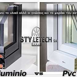 Παράγουμε, κατασκευάσουμε κουφώματα, αλουμινίου, pvc, συνθετικά, Etem, Europa, Rehau, ηχομόνωση, θερμομόνωση, ενεργειακά, εξοικονομώ κατ'οίκον, ανακαίνιση, αντικατάσταση, εγγύηση   Προφίλ εταιρείας STYLETECH.sa Σας ευχαριστούμε για το ενδιαφέρον σας στα προϊόντα της εταιρίας µας. H STYLETECH είναι µια κατασκευαστική εταιρία κουφωμάτων αλουμινίου και U-pvc. Ιδρύθηκε το 1992 και είναι από τις πιο ραγδαία αναπτυσσόμενες του κλάδου. Με πάνω από 36 χρόνια εμπειρίας και σύγχρονης τεχνολογίας κουφωμάτων, παράγουμε προϊόντα υψηλής ποιότητας που δημιουργούν αξία για τους πελάτες μας μειώνοντας παράλληλα το κόστος. Η ευέλικτη δομή της εταιρείας μας, σε συνδυασμό με την τεχνογνωσία των εργαζομένων και των συνεργατών μας εγγυώνται την σταθερή ποιότητα και την τεχνική ακμή ολόκληρης της γραμμής μας. Πέρα από τον άρτιο και σύγχρονο µηχανολογικό µας εξοπλισµό αλλά και το εξειδικευµένο προσωπικό, έχουµε αποκτήσει τα απαιτούμενα πιστοποιητικά ποιότητος, και συνεχώς βελτιωνόμαστε τεχνολογικά ,με σεβασμό στο περιβάλλον. Στα πατζούρια, έχουµε την δυνατότητα να παράγουµε δικό µας προφίλ, το οποίο είναι πιστοποιημένο με αποκλειστικότητα σε 9 μποφόρ και class 6. Μπορεί να κατασκευαστεί σε µονόφυλλο, δίφυλλο, τρίφυλλο, τετράφυλλο και εξάφυλλο. ∆ίνουµε µεγάλη σηµασία στην λεπτοµέρεια και την λειτουργικότητα της κατασκευής, για αυτό οι συνδέσεις κουφωμάτων βαρέων προφίλ και θέρμο γίνονται µε δέσιµο πρέσας, η οποία είναι 100% προφίλ αλουµινίου και µπαίνει µε ειδική κόλλα και αρµόκολλα στις διατοµές του προφίλ. Το δύσκολο δεν είναι αποθαρρυντικό, αλλά αποτελεί για εμάς πρόκληση! Από τότε έως σήμερα, βασισμένη πάντα στο δημιουργικό μεράκι και την πείρα, και με αποκλειστικό γνώμονα όλες τις αρχιτεκτονικές απαιτήσεις των πελατών, προσφέρει κατασκευές με εξαιρετική αντοχή και αισθητική, όπου καλύπτουν τις ανάγκες σε κουφώματα, κάγκελα, πόρτες και παράθυρα. Η εταιρεία διαθέτει συστήματα αλουμινίου και u-pvc, για ιδιώτες που θέλουν αξιόπιστες λύσεις για το σπίτι. Τα ποιοτικά συστήματα αλουμινίου και u-pvc, προηγμένης τεχνολογίας που προσφέρονται στην STYLETECH.sa, εγγυώνται σίγουρα αποτελέσματα και την δυνατότητα στην προσφυγή ευέλικτων λύσεων, επιφέροντας πάντα το αισθητικά επιθυμητό, αλλά και λειτουργικό αποτέλεσμα. Για τις κατασκευαστικές εταιρείες, η εταιρεία STYLETECH.sa προτείνει προϊόντα που πληρούν όλες τις ευρωπαϊκές προδιαγραφές με όλες τις απαραίτητες-διεθνής-πιστοποιήσεις. Η εταιρεία μας, έχοντας μία πολύχρονη πετυχημένη και συνεπή παρουσία στην ελληνική αγορά, είναι σήμερα ένα από τα πλέον αξιόλογα ονόματα στον χώρο των κατασκευών αλουμινίου και u-pvc. Η πολυετής παρουσία μας στον κλάδο κατασκευής αλουμινίου και u-pvc, και οι ικανοποιημένοι πελάτες μας, είναι εγγύηση ότι οι κατασκευές μας υπερέχουν από πλευράς ποιότητας, λειτουργικότητας και αισθητικής. Η ιδιαίτερη επιμέλεια στη ποιοτική κατασκευή των προϊόντων, η σωστή εφαρμογή τους, η προσοχή στη λεπτομέρεια και η συνέπεια στους χρόνους παράδοσης, χαρακτηρίζουν την εταιρεία και της χαρίζουν ένα όνομα εμπιστοσύνης. Η εταιρεία μας επιλέγει τα προφίλ αλουμινίου της Εtem building, Europa, Alouminco, της μοναδικής εταιρείας στο είδος της, που απέκτησε τα Ευρωπαϊκά εξειδικευμένα πιστοποιητικά ποιότητας QUALANOD (για την ανοδίωση) και QUALICOAT (για την ηλεκτροστατική βαφή). Η εταιρεία μας επιλέγει τα προφίλ u-pvc, από τις πιο αξιόλογες εταιρείες τις ευρωπαϊκ