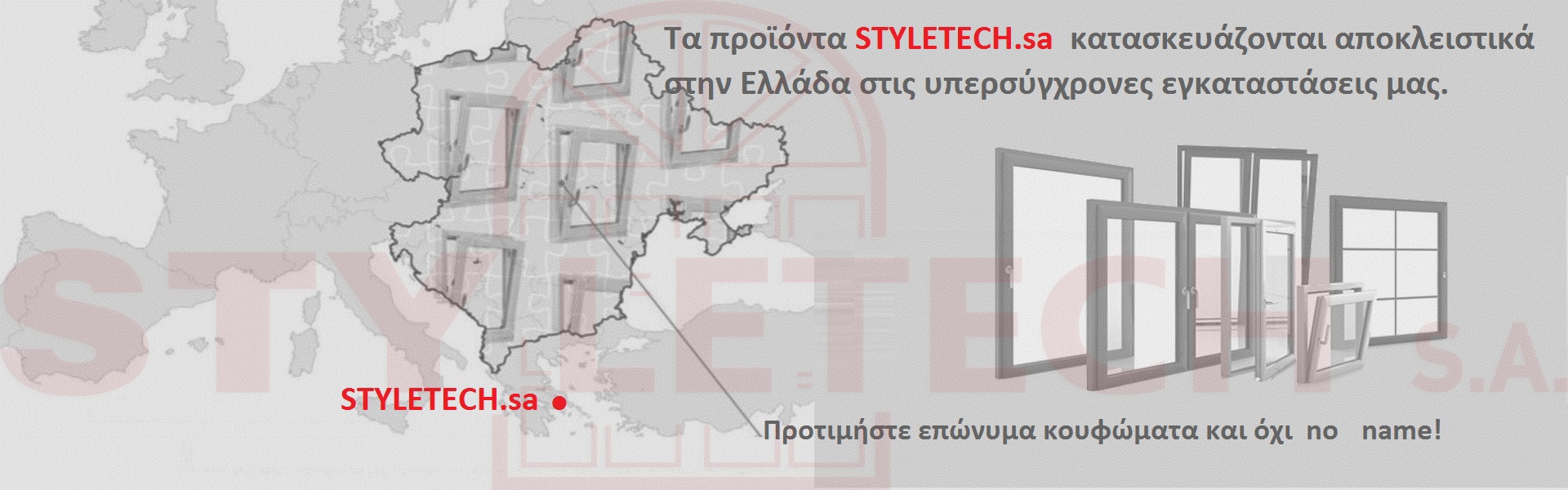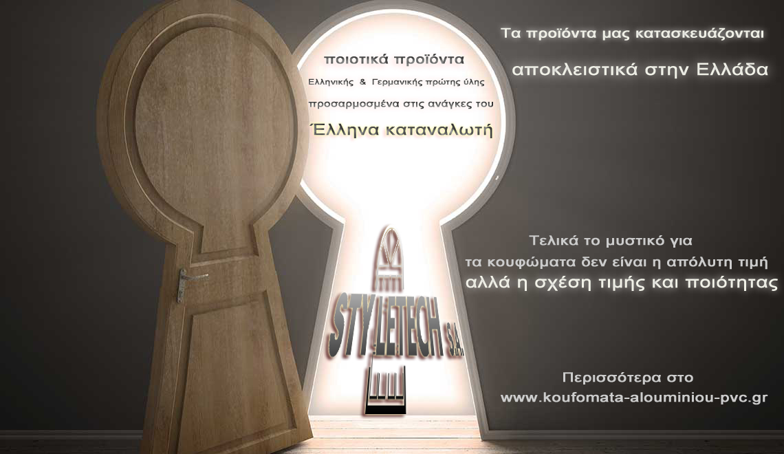 Παράγουμε, κατασκευάσουμε κουφώματα, αλουμινίου, pvc, συνθετικά, Etem, Europa, Rehau, ηχομόνωση, θερμομόνωση, ενεργειακά, εξοικονομώ κατ'οίκον, ανακαίνιση, αντικατάσταση, εγγύηση   Προφίλ εταιρείας STYLETECH.sa Σας ευχαριστούμε για το ενδιαφέρον σας στα προϊόντα της εταιρίας µας. H STYLETECH είναι µια κατασκευαστική εταιρία κουφωμάτων αλουμινίου και U-pvc. Ιδρύθηκε το 1992 και είναι από τις πιο ραγδαία αναπτυσσόμενες του κλάδου. Με πάνω από 36 χρόνια εμπειρίας και σύγχρονης τεχνολογίας κουφωμάτων, παράγουμε προϊόντα υψηλής ποιότητας που δημιουργούν αξία για τους πελάτες μας μειώνοντας παράλληλα το κόστος. Η ευέλικτη δομή της εταιρείας μας, σε συνδυασμό με την τεχνογνωσία των εργαζομένων και των συνεργατών μας εγγυώνται την σταθερή ποιότητα και την τεχνική ακμή ολόκληρης της γραμμής μας. Πέρα από τον άρτιο και σύγχρονο µηχανολογικό µας εξοπλισµό αλλά και το εξειδικευµένο προσωπικό, έχουµε αποκτήσει τα απαιτούμενα πιστοποιητικά ποιότητος, και συνεχώς βελτιωνόμαστε τεχνολογικά ,με σεβασμό στο περιβάλλον. Στα πατζούρια, έχουµε την δυνατότητα να παράγουµε δικό µας προφίλ, το οποίο είναι πιστοποιημένο με αποκλειστικότητα σε 9 μποφόρ και class 6. Μπορεί να κατασκευαστεί σε µονόφυλλο, δίφυλλο, τρίφυλλο, τετράφυλλο και εξάφυλλο. ∆ίνουµε µεγάλη σηµασία στην λεπτοµέρεια και την λειτουργικότητα της κατασκευής, για αυτό οι συνδέσεις κουφωμάτων βαρέων προφίλ και θέρμο γίνονται µε δέσιµο πρέσας, η οποία είναι 100% προφίλ αλουµινίου και µπαίνει µε ειδική κόλλα και αρµόκολλα στις διατοµές του προφίλ. Το δύσκολο δεν είναι αποθαρρυντικό, αλλά αποτελεί για εμάς πρόκληση! Από τότε έως σήμερα, βασισμένη πάντα στο δημιουργικό μεράκι και την πείρα, και με αποκλειστικό γνώμονα όλες τις αρχιτεκτονικές απαιτήσεις των πελατών, προσφέρει κατασκευές με εξαιρετική αντοχή και αισθητική, όπου καλύπτουν τις ανάγκες σε κουφώματα, κάγκελα, πόρτες και παράθυρα. Η εταιρεία διαθέτει συστήματα αλουμινίου και u-pvc, για ιδιώτες που θέλουν αξιόπιστες λύσεις για το σπίτι. Τα ποιοτικά συστήματα αλουμινίου και u-pvc, προηγμένης τεχνολογίας που προσφέρονται στην STYLETECH.sa, εγγυώνται σίγουρα αποτελέσματα και την δυνατότητα στην προσφυγή ευέλικτων λύσεων, επιφέροντας πάντα το αισθητικά επιθυμητό, αλλά και λειτουργικό αποτέλεσμα. Για τις κατασκευαστικές εταιρείες, η εταιρεία STYLETECH.sa προτείνει προϊόντα που πληρούν όλες τις ευρωπαϊκές προδιαγραφές με όλες τις απαραίτητες-διεθνής-πιστοποιήσεις. Η εταιρεία μας, έχοντας μία πολύχρονη πετυχημένη και συνεπή παρουσία στην ελληνική αγορά, είναι σήμερα ένα από τα πλέον αξιόλογα ονόματα στον χώρο των κατασκευών αλουμινίου και u-pvc. Η πολυετής παρουσία μας στον κλάδο κατασκευής αλουμινίου και u-pvc, και οι ικανοποιημένοι πελάτες μας, είναι εγγύηση ότι οι κατασκευές μας υπερέχουν από πλευράς ποιότητας, λειτουργικότητας και αισθητικής. Η ιδιαίτερη επιμέλεια στη ποιοτική κατασκευή των προϊόντων, η σωστή εφαρμογή τους, η προσοχή στη λεπτομέρεια και η συνέπεια στους χρόνους παράδοσης, χαρακτηρίζουν την εταιρεία και της χαρίζουν ένα όνομα εμπιστοσύνης. Η εταιρεία μας επιλέγει τα προφίλ αλουμινίου της Εtem building, Europa, Alouminco, της μοναδικής εταιρείας στο είδος της, που απέκτησε τα Ευρωπαϊκά εξειδικευμένα πιστοποιητικά ποιότητας QUALANOD (για την ανοδίωση) και QUALICOAT (για την ηλεκτροστατική βαφή). Η εταιρεία μας επιλέγει τα προφίλ u-pvc, από τις πιο αξιόλογες εταιρείες τις ευρωπαϊκ