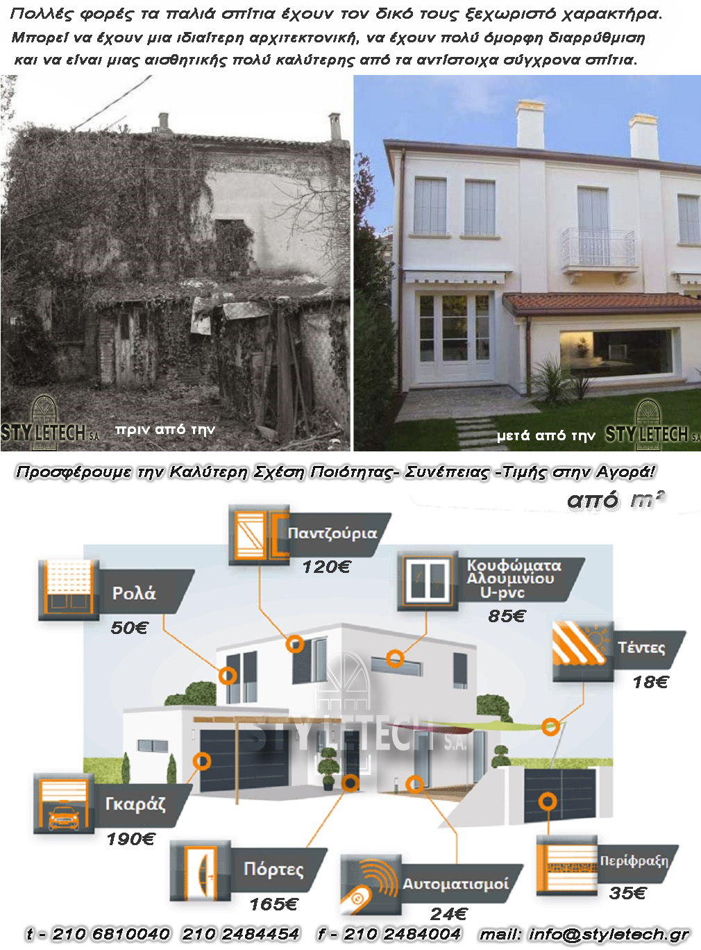 Παράγουμε, κατασκευάσουμε κουφώματα, αλουμινίου, pvc, συνθετικά, Etem, Europa, Rehau, ηχομόνωση, θερμομόνωση, ενεργειακά, εξοικονομώ κατ'οίκον, ανακαίνιση, αντικατάσταση, εγγύηση   Προφίλ εταιρείας STYLETECH.sa Σας ευχαριστούμε για το ενδιαφέρον σας στα προϊόντα της εταιρίας µας. H STYLETECH είναι µια κατασκευαστική εταιρία κουφωμάτων αλουμινίου και U-pvc. Ιδρύθηκε το 1992 και είναι από τις πιο ραγδαία αναπτυσσόμενες του κλάδου. Με πάνω από 36 χρόνια εμπειρίας και σύγχρονης τεχνολογίας κουφωμάτων, παράγουμε προϊόντα υψηλής ποιότητας που δημιουργούν αξία για τους πελάτες μας μειώνοντας παράλληλα το κόστος. Η ευέλικτη δομή της εταιρείας μας, σε συνδυασμό με την τεχνογνωσία των εργαζομένων και των συνεργατών μας εγγυώνται την σταθερή ποιότητα και την τεχνική ακμή ολόκληρης της γραμμής μας. Πέρα από τον άρτιο και σύγχρονο µηχανολογικό µας εξοπλισµό αλλά και το εξειδικευµένο προσωπικό, έχουµε αποκτήσει τα απαιτούμενα πιστοποιητικά ποιότητος, και συνεχώς βελτιωνόμαστε τεχνολογικά ,με σεβασμό στο περιβάλλον. Στα πατζούρια, έχουµε την δυνατότητα να παράγουµε δικό µας προφίλ, το οποίο είναι πιστοποιημένο με αποκλειστικότητα σε 9 μποφόρ και class 6. Μπορεί να κατασκευαστεί σε µονόφυλλο, δίφυλλο, τρίφυλλο, τετράφυλλο και εξάφυλλο. ∆ίνουµε µεγάλη σηµασία στην λεπτοµέρεια και την λειτουργικότητα της κατασκευής, για αυτό οι συνδέσεις κουφωμάτων βαρέων προφίλ και θέρμο γίνονται µε δέσιµο πρέσας, η οποία είναι 100% προφίλ αλουµινίου και µπαίνει µε ειδική κόλλα και αρµόκολλα στις διατοµές του προφίλ. Το δύσκολο δεν είναι αποθαρρυντικό, αλλά αποτελεί για εμάς πρόκληση! Από τότε έως σήμερα, βασισμένη πάντα στο δημιουργικό μεράκι και την πείρα, και με αποκλειστικό γνώμονα όλες τις αρχιτεκτονικές απαιτήσεις των πελατών, προσφέρει κατασκευές με εξαιρετική αντοχή και αισθητική, όπου καλύπτουν τις ανάγκες σε κουφώματα, κάγκελα, πόρτες και παράθυρα. Η εταιρεία διαθέτει συστήματα αλουμινίου και u-pvc, για ιδιώτες που θέλουν αξιόπιστες λύσεις για το σπίτι. Τα ποιοτικά συστήματα αλουμινίου και u-pvc, προηγμένης τεχνολογίας που προσφέρονται στην STYLETECH.sa, εγγυώνται σίγουρα αποτελέσματα και την δυνατότητα στην προσφυγή ευέλικτων λύσεων, επιφέροντας πάντα το αισθητικά επιθυμητό, αλλά και λειτουργικό αποτέλεσμα. Για τις κατασκευαστικές εταιρείες, η εταιρεία STYLETECH.sa προτείνει προϊόντα που πληρούν όλες τις ευρωπαϊκές προδιαγραφές με όλες τις απαραίτητες-διεθνής-πιστοποιήσεις. Η εταιρεία μας, έχοντας μία πολύχρονη πετυχημένη και συνεπή παρουσία στην ελληνική αγορά, είναι σήμερα ένα από τα πλέον αξιόλογα ονόματα στον χώρο των κατασκευών αλουμινίου και u-pvc. Η πολυετής παρουσία μας στον κλάδο κατασκευής αλουμινίου και u-pvc, και οι ικανοποιημένοι πελάτες μας, είναι εγγύηση ότι οι κατασκευές μας υπερέχουν από πλευράς ποιότητας, λειτουργικότητας και αισθητικής. Η ιδιαίτερη επιμέλεια στη ποιοτική κατασκευή των προϊόντων, η σωστή εφαρμογή τους, η προσοχή στη λεπτομέρεια και η συνέπεια στους χρόνους παράδοσης, χαρακτηρίζουν την εταιρεία και της χαρίζουν ένα όνομα εμπιστοσύνης. Η εταιρεία μας επιλέγει τα προφίλ αλουμινίου της Εtem building, Europa, Alouminco, της μοναδικής εταιρείας στο είδος της, που απέκτησε τα Ευρωπαϊκά εξειδικευμένα πιστοποιητικά ποιότητας QUALANOD (για την ανοδίωση) και QUALICOAT (για την ηλεκτροστατική βαφή). Η εταιρεία μας επιλέγει τα προφίλ u-pvc, από τις πιο αξιόλογες εταιρείες τις ευρωπαϊκ